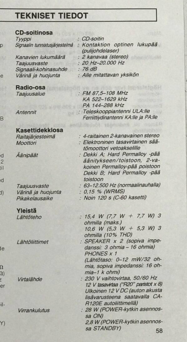 Cd-soitin, radio FM/KA/PA, kasettidekkiosat: dekki A, dekki B