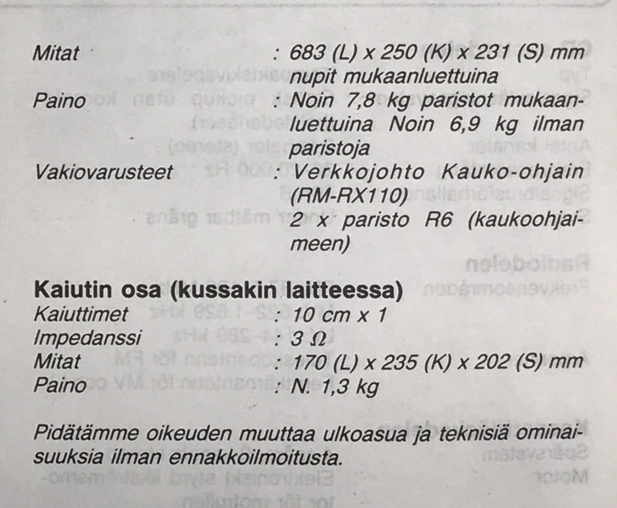 Mallinumerot: Cd-soitin PC-X110, kasettidekit A/B PC-RX110 ja kaiutinjärjestelmä PC-B1011 (imp. 3 ohm, 8 W max.)