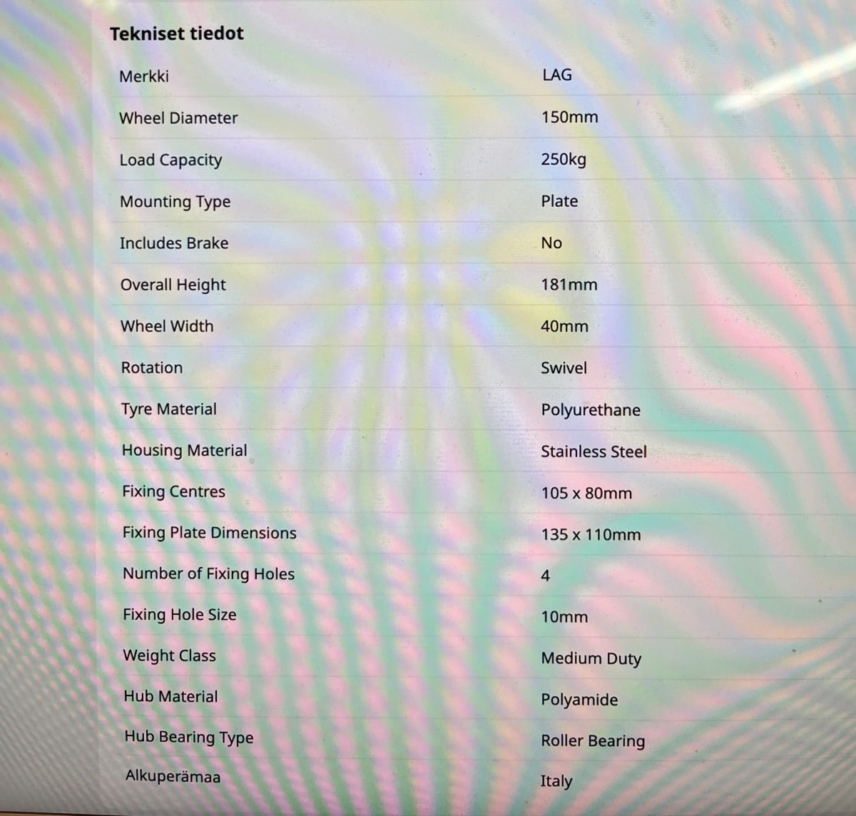 Kalustepyörä LAG raskaaseen käyttöön 150 × 40 mm jarrulla
