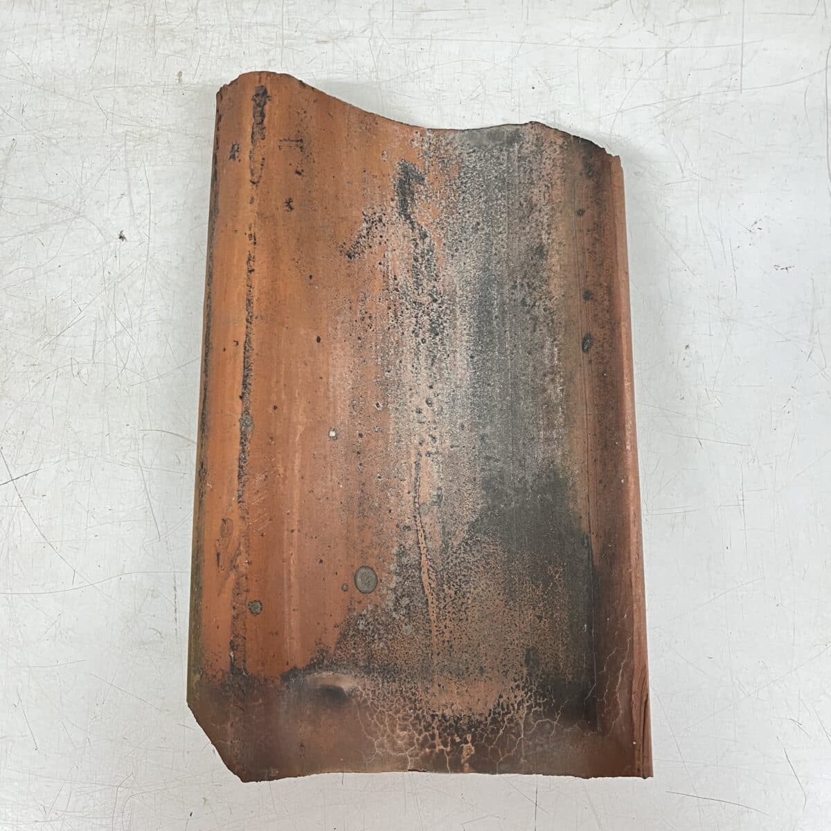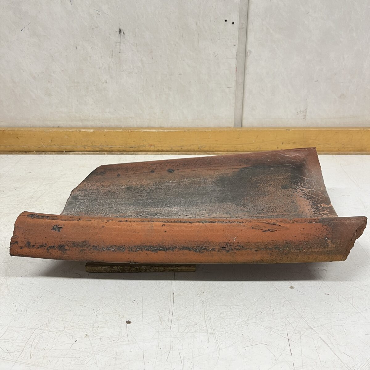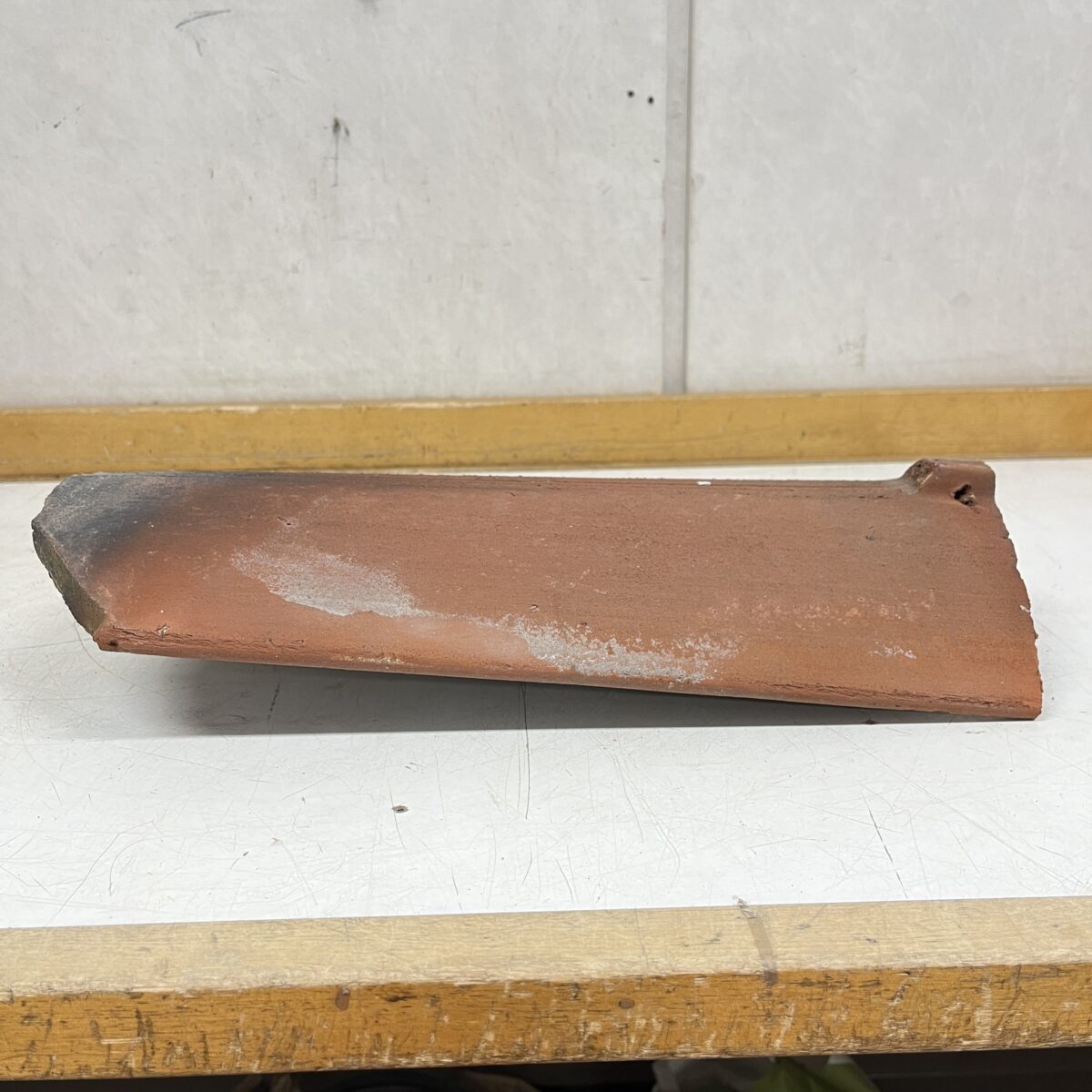 Katon vesikourun tiili, tiili malliltaan hieman kieron mallinen.