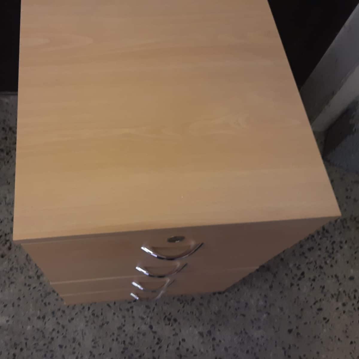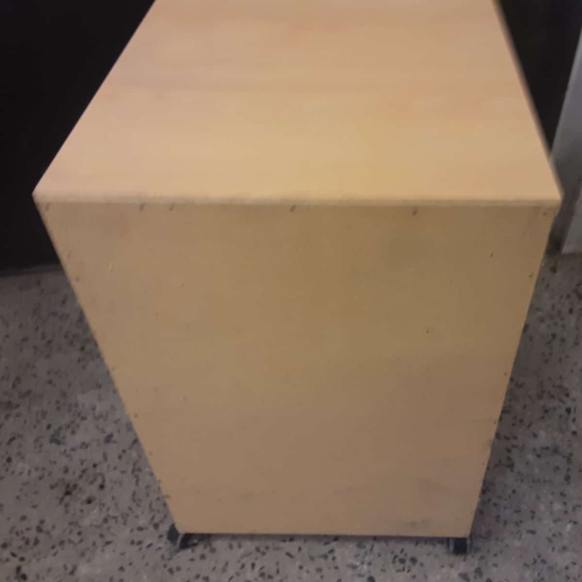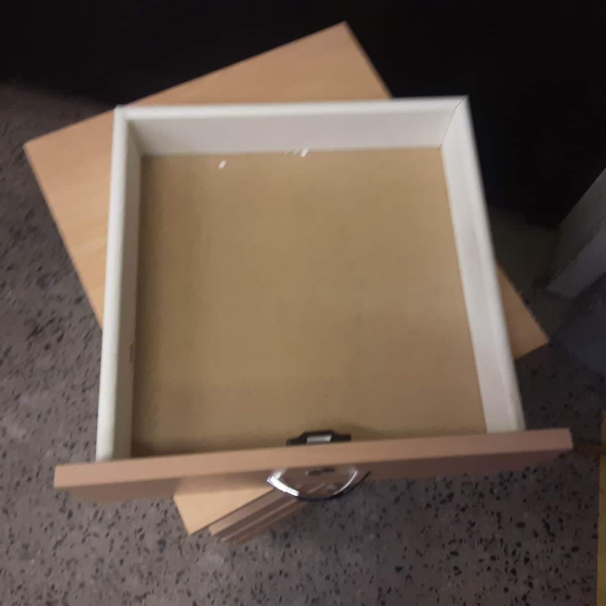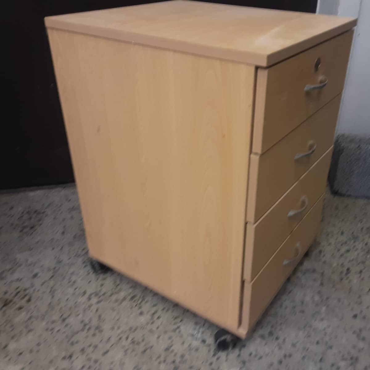 Kalustelevystä tehty laatikosto 4:llä laatikolla, ylimmäisessä lukko mutta ei avainta.