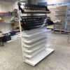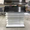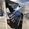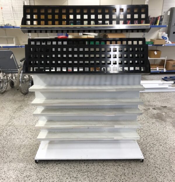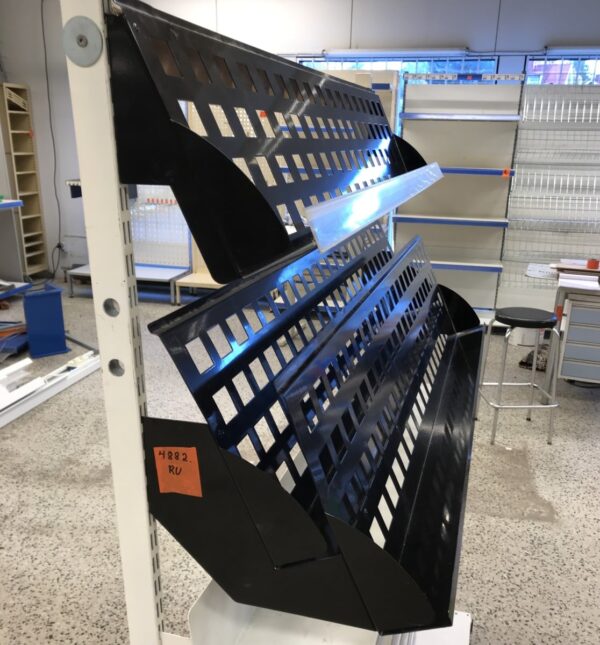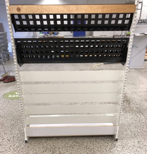kapeita hyllyjä sekä 2 kpl mustia kallistettuja