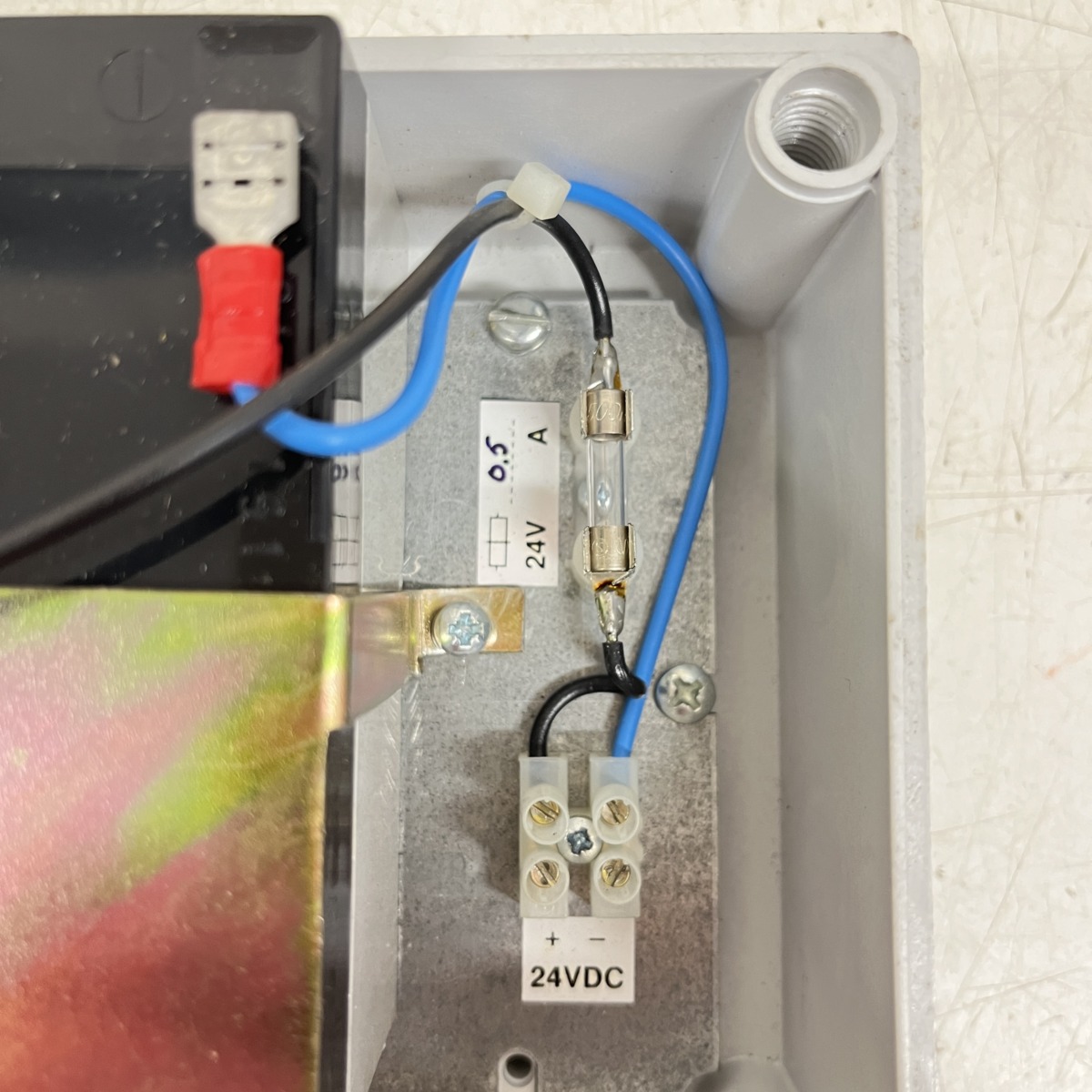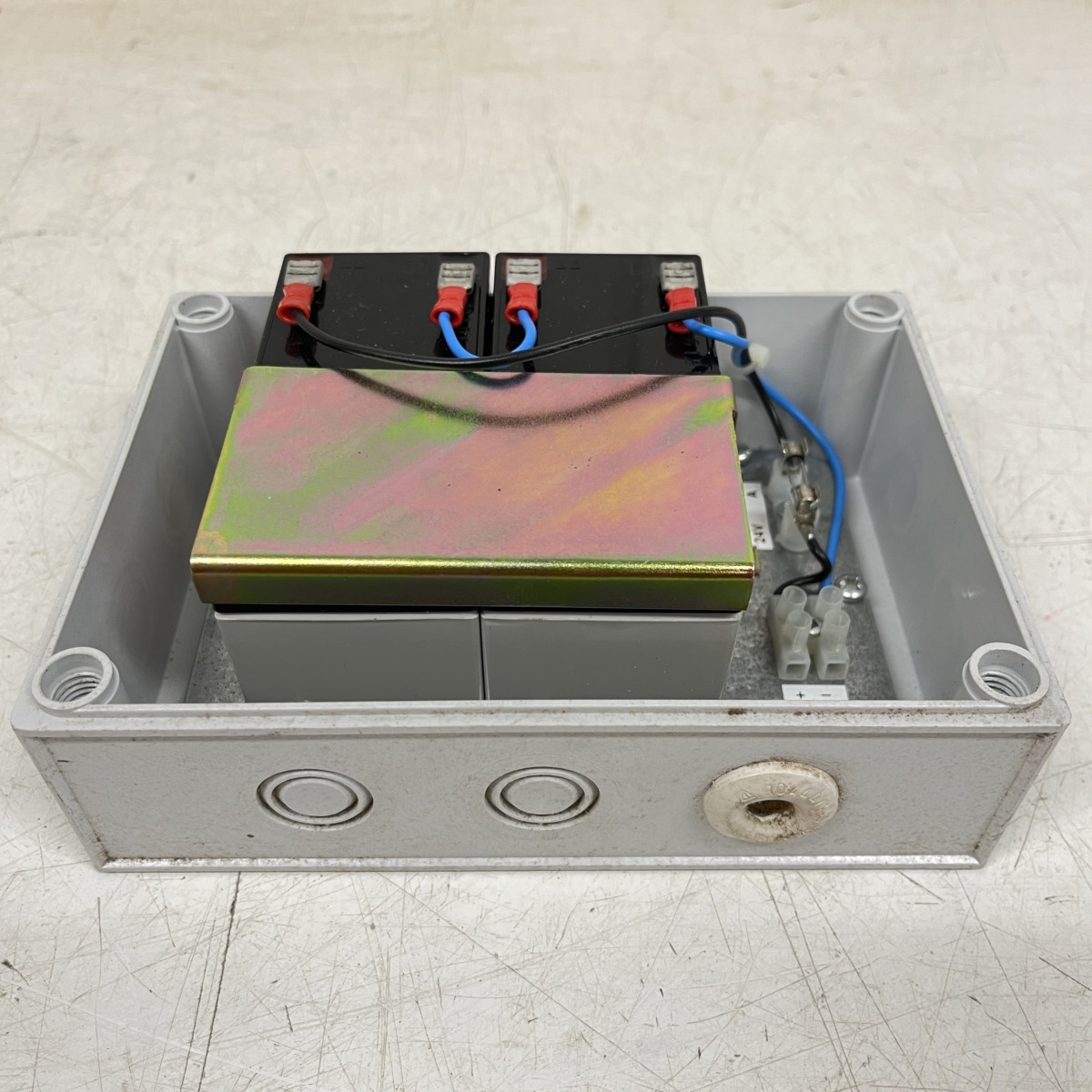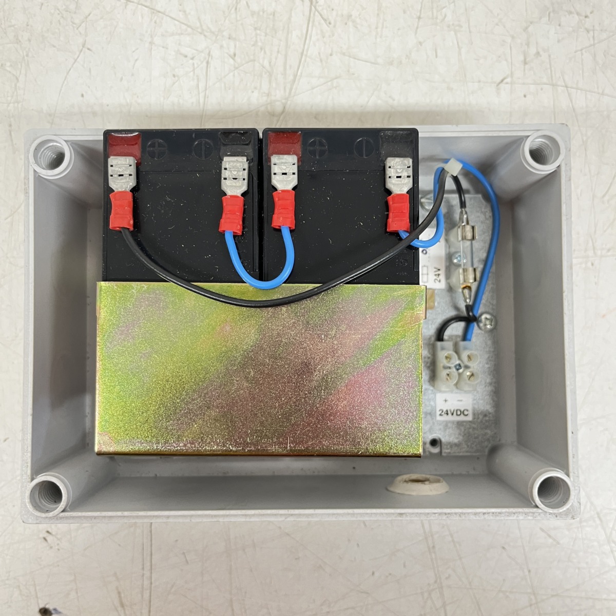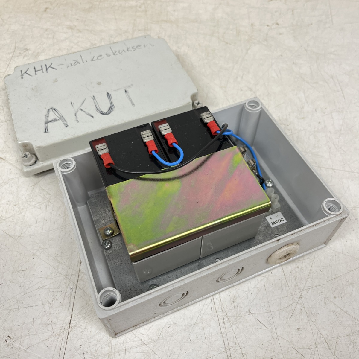 Sisällä teline 2:lle pienakulle, sekä suojasulake.