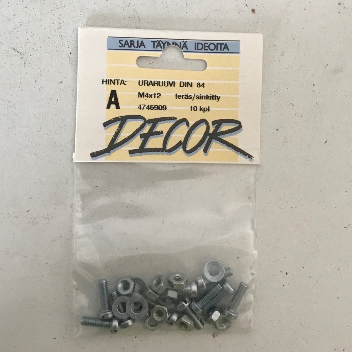 Sinkitty teräsruuvi M4x12 mm, mutteri ja aluslevy 10 kpl