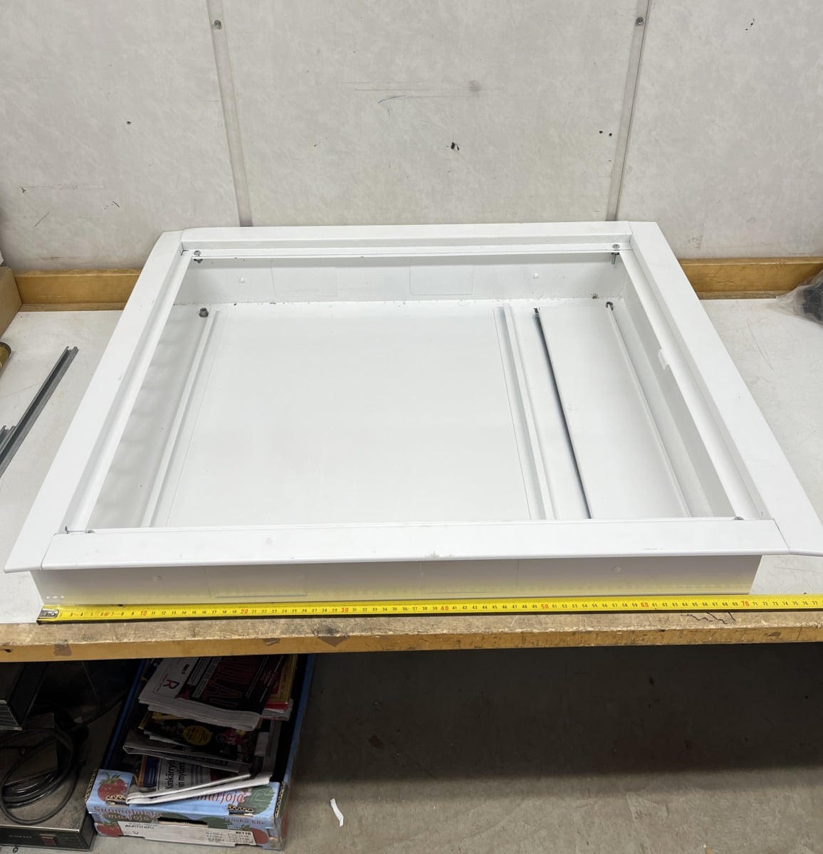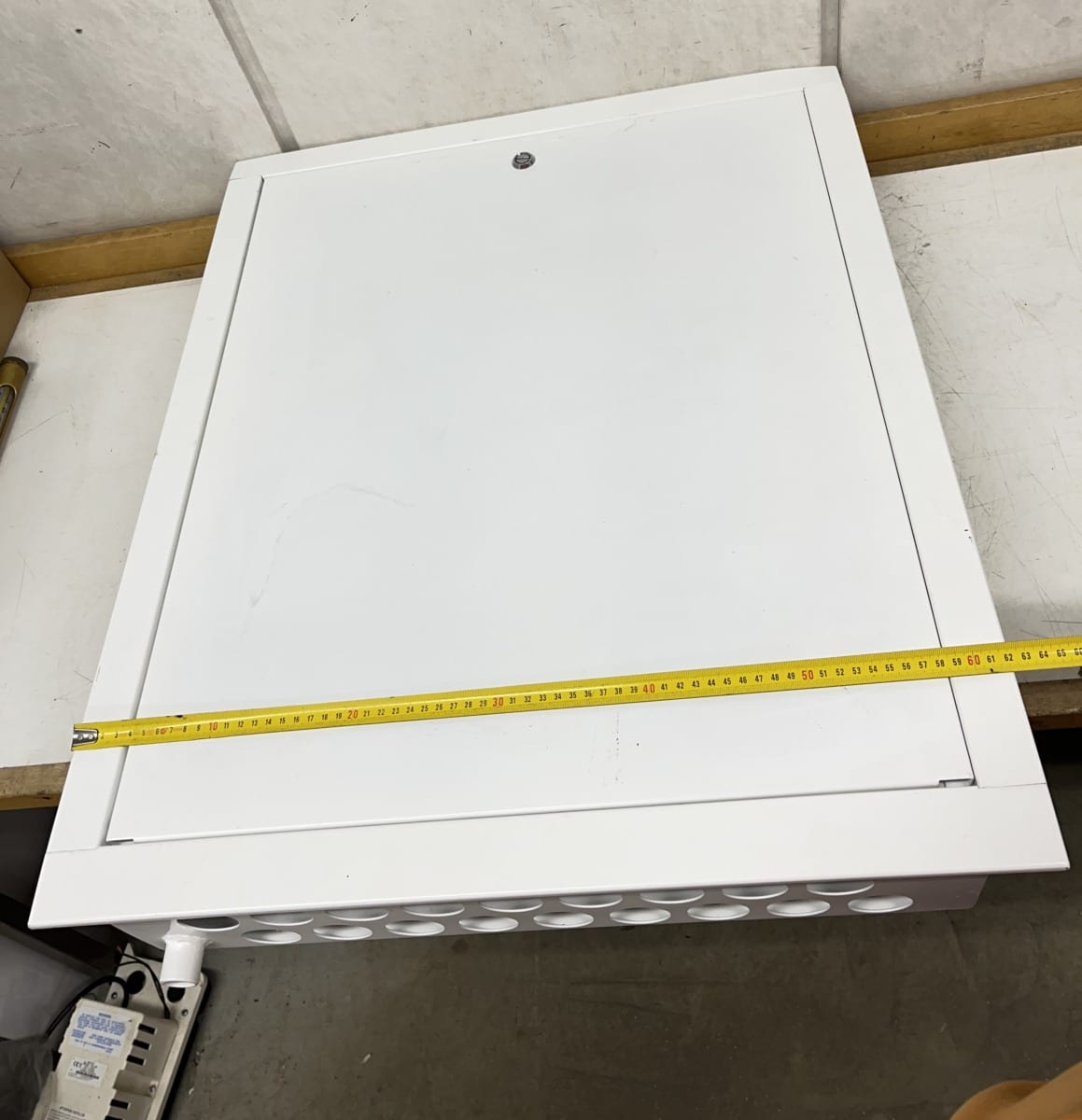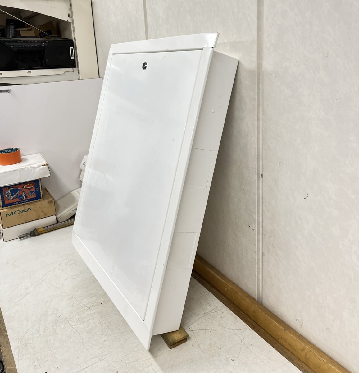 normaalin sähkökeskuksen kotelo. Kehys hieman taipunut yläreunasta, myös