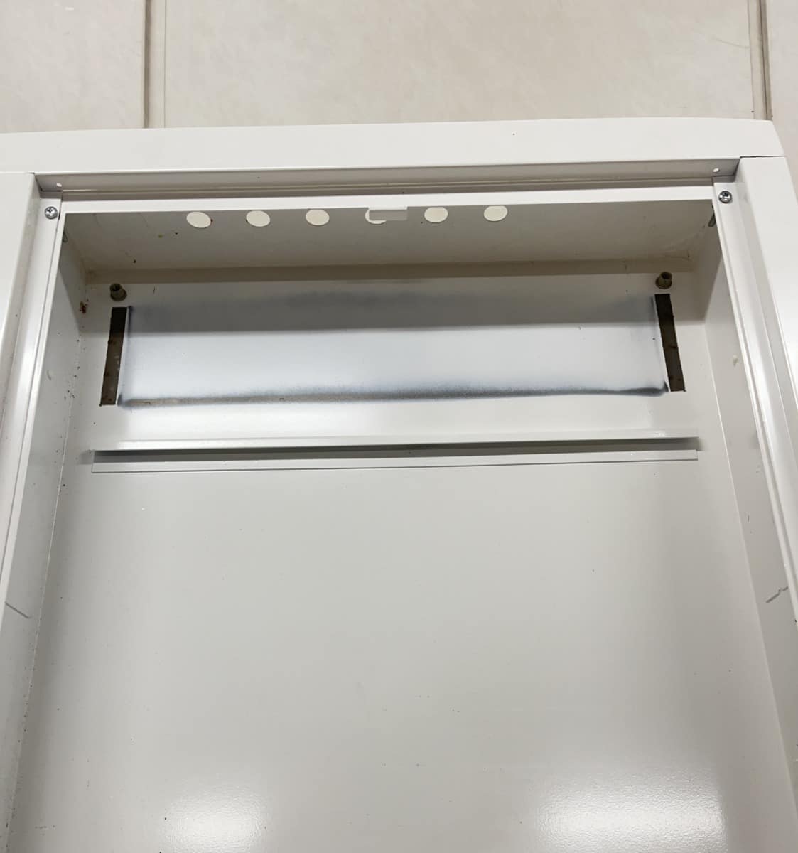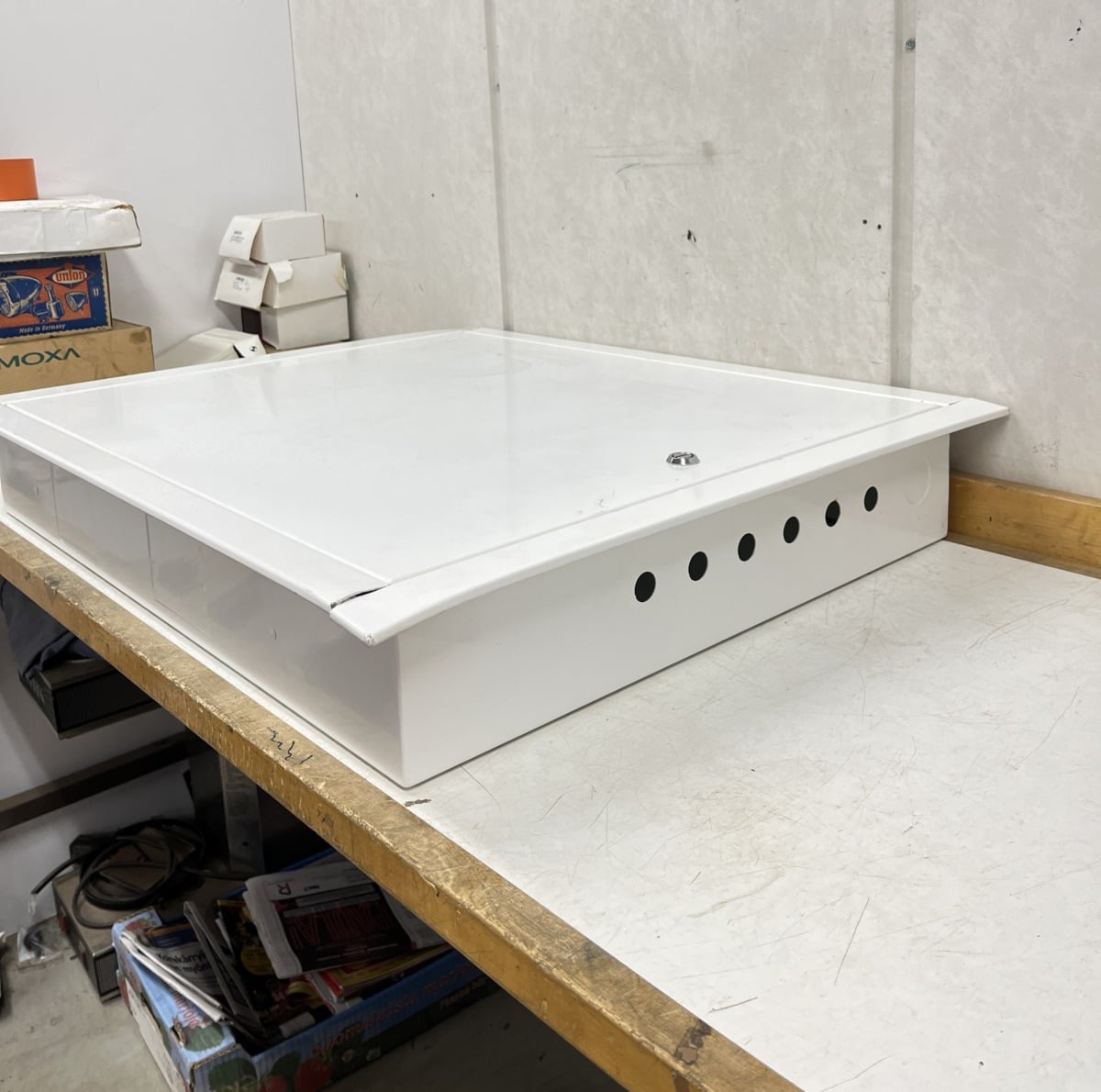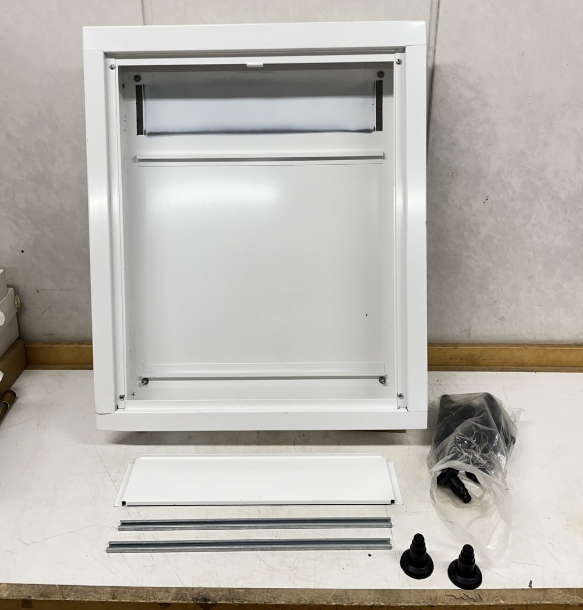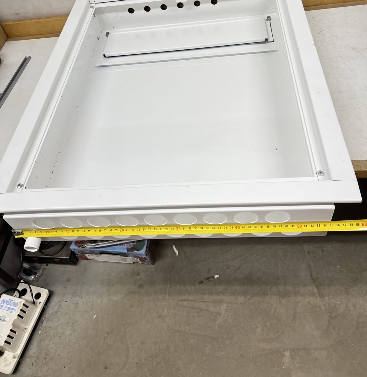 normaalin sähkökeskuksen kotelo. Kehys hieman taipunut yläreunasta, myös